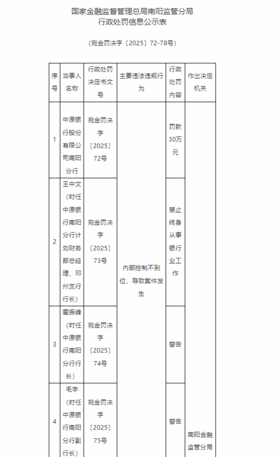 12月19日,国家金融监督管理总局南阳监管分局行政处罚信息公示表显示,中原银行股份有限公司南阳分行,内部控制不到位,导致案件发生,被罚款30万元;王中文(时任中原银行南阳分行计划财务部总经理、邓州支行行长),被禁止终身从事银行业工作;霍振峰(时任中原银行南阳分行行长)、毛宇(时任中原银行南阳分行副行长),均被警告。